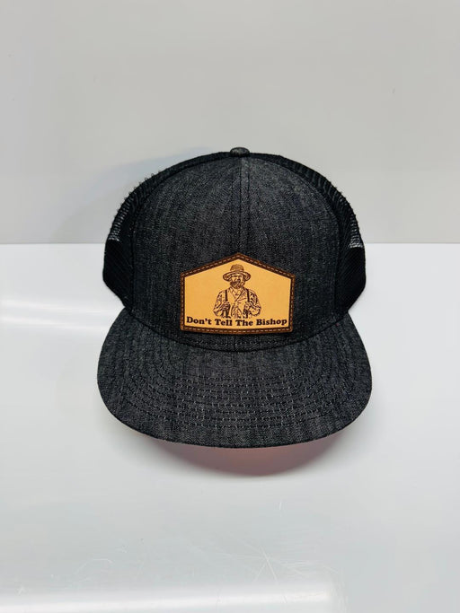 tkrodeoLow stockTrucker Hat- Adjustable Snap Back Don't Tell the Bishop Leather Patch center front of hat SHAPE Mid-Pro FABRIC Cotton-Poly/Nylon Mesh VISOR Pr...